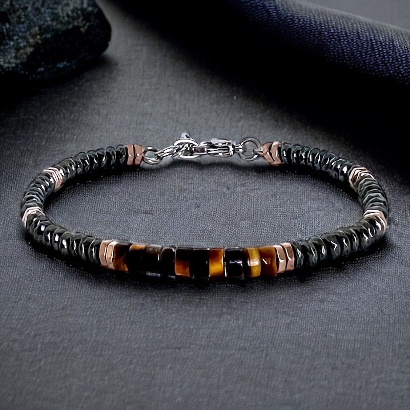 Bracelet Homme Acier, Œil de Tigre et Hématite.