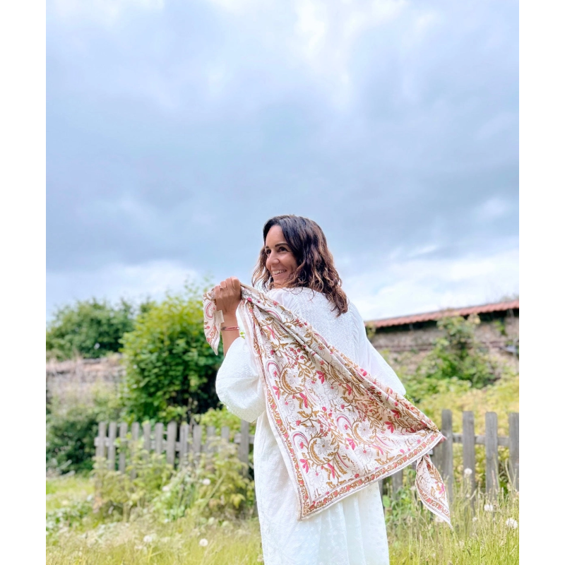 Ce foulard très souple et doux est confectionné artisanalement grâce à la technique indienne du block-print, les couleurs sont réalisées à partir de pigments naturels.