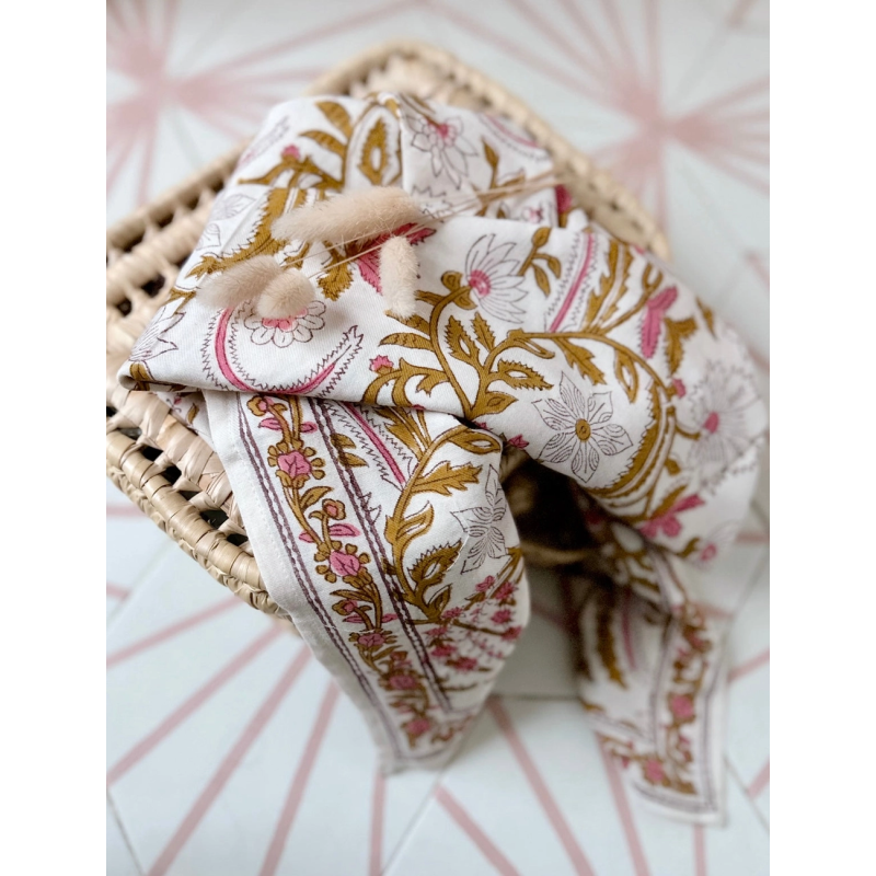Ce foulard est confectionné artisanalement grâce à la technique indienne du block-print, les couleurs sont réalisées à partir de pigments naturels. Cette confection manuelle peut entraîner certaines irrégularités qui en font le charme en le rendant unique ♡