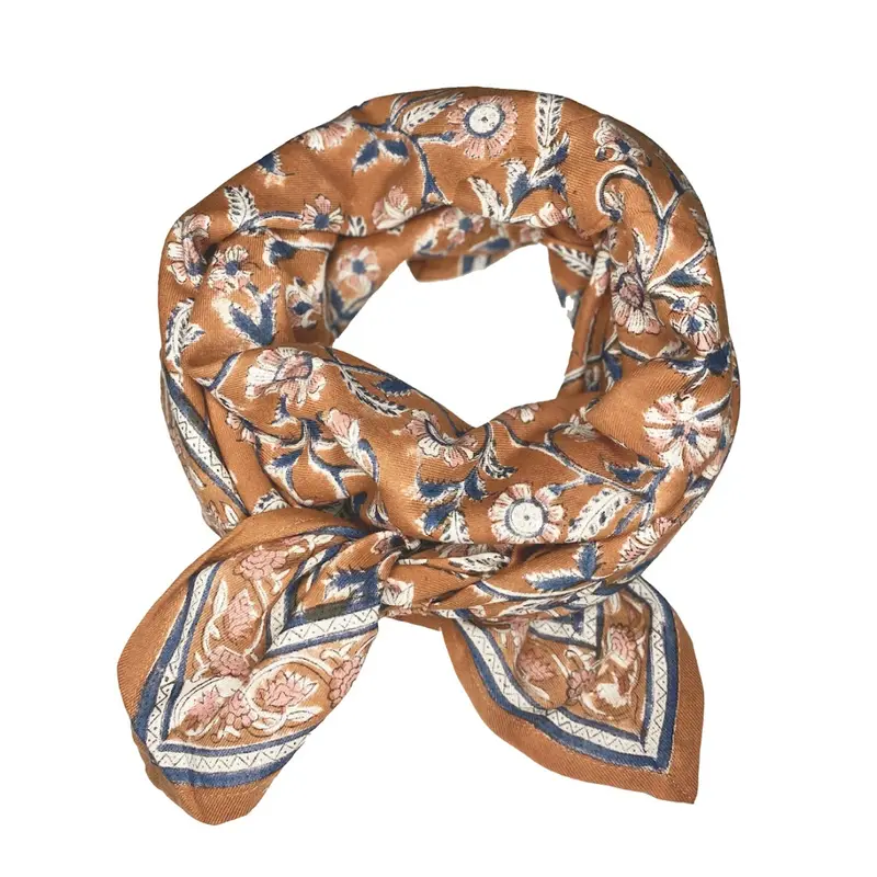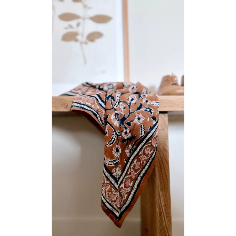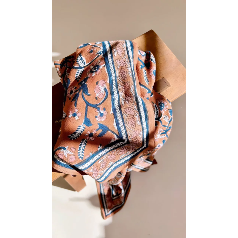 Ce foulard est confectionné artisanalement grâce à la technique indienne du block-print, les couleurs sont réalisées à partir de pigments naturels.
