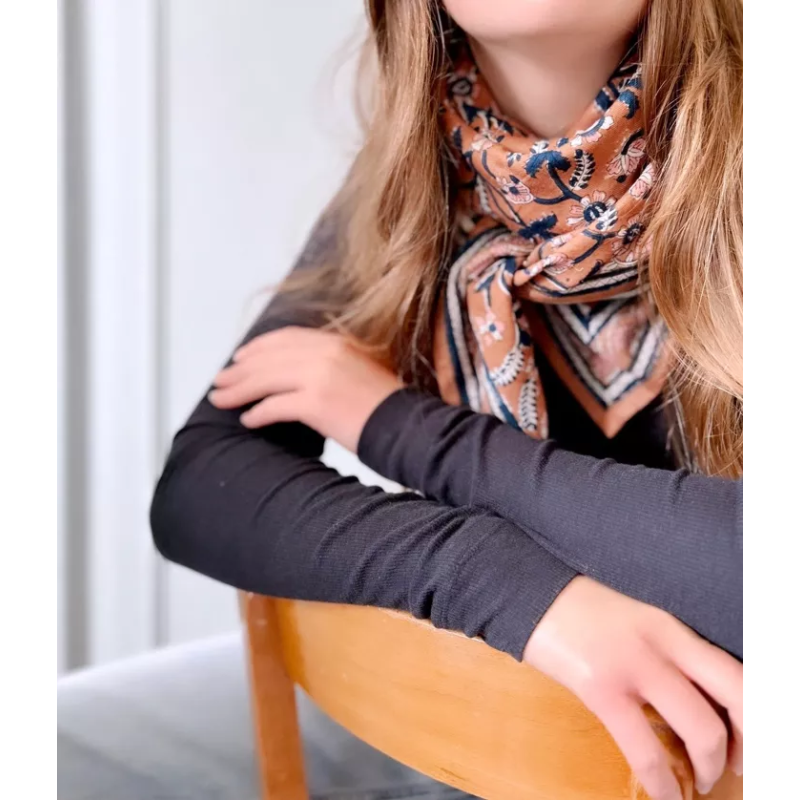 Ce foulard est confectionné artisanalement grâce à la technique indienne du block-print, les couleurs sont réalisées à partir de pigments naturels. Cette confection manuelle peut entraîner certaines irrégularités qui en font le charme en le rendant unique ♡