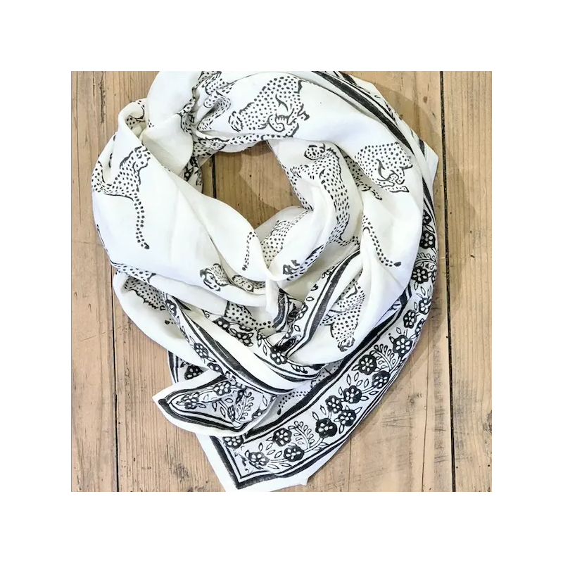 Ce foulard très souple et doux est confectionné artisanalement grâce à la technique indienne du block-print, les couleurs sont réalisées à partir de pigments naturels.