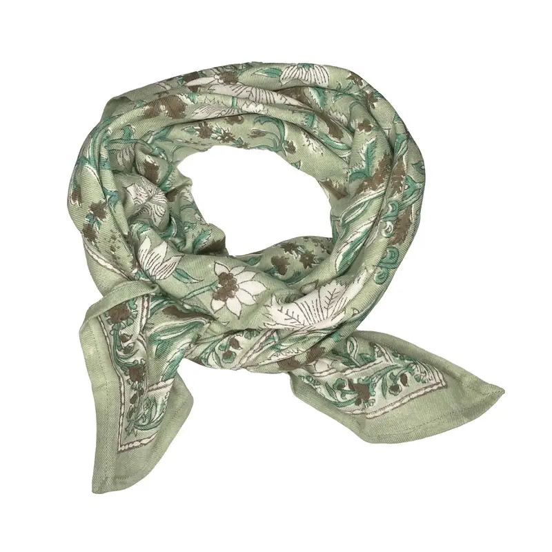 Ce foulard très souple et doux est confectionné artisanalement grâce à la technique indienne du block-print, les couleurs sont réalisées à partir de pigments naturels.