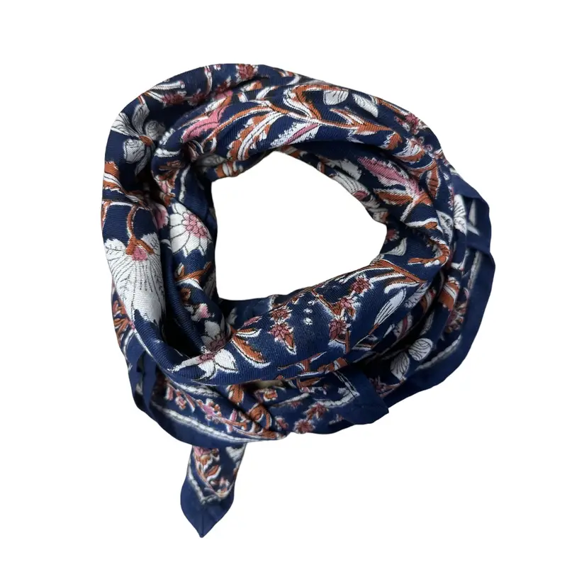 Ce foulard est confectionné artisanalement grâce à la technique indienne du block-print, les couleurs sont réalisées à partir de pigments naturels.
