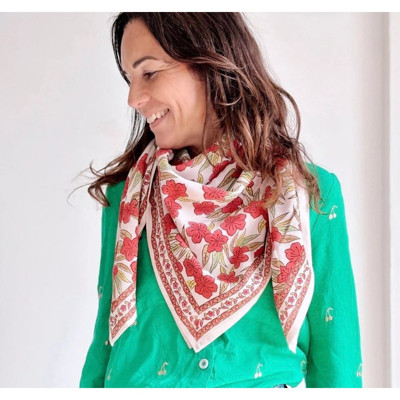 Ce foulard est confectionné artisanalement grâce à la technique indienne du block-print, les couleurs sont réalisées à partir de pigments naturels. Cette confection manuelle peut entraîner certaines irrégularités qui en font le charme en le rendant unique ♡