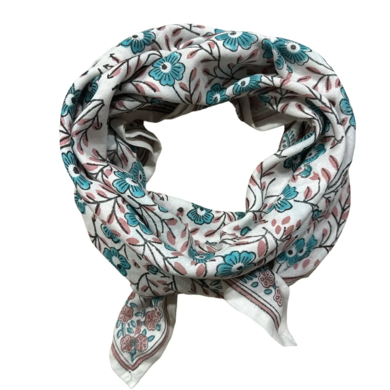 Ce foulard très souple et doux est confectionné artisanalement grâce à la technique indienne du block-print, les couleurs sont réalisées à partir de pigments naturels.
