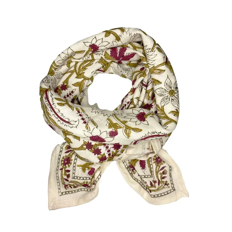 Ce foulard très souple et doux est confectionné artisanalement grâce à la technique indienne du block-print, les couleurs sont réalisées à partir de pigments naturels.