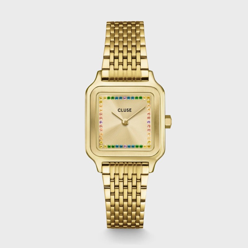 Montre femme Gracieuse carrée signée CLUSE. La montre carrée Gracieuse Petite pour femme est dotée d'un boîtier doré de 24 mm, d'un cadran doré serti de pierres multicolores et d'un bracelet en acier inoxydable doré de 14 mm. Vous pouvez ajuster la taille du bracelet vous-même.