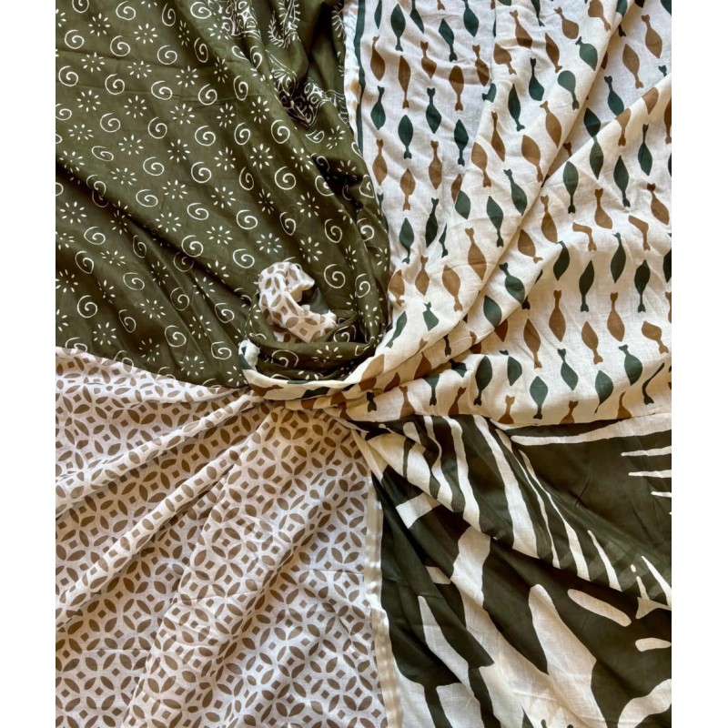 Foulard carré Nadia signé Shanna composé de d’un assemblage de 4 carrés de tissus différents, agrémenté de rubans décoratifs et assortis.